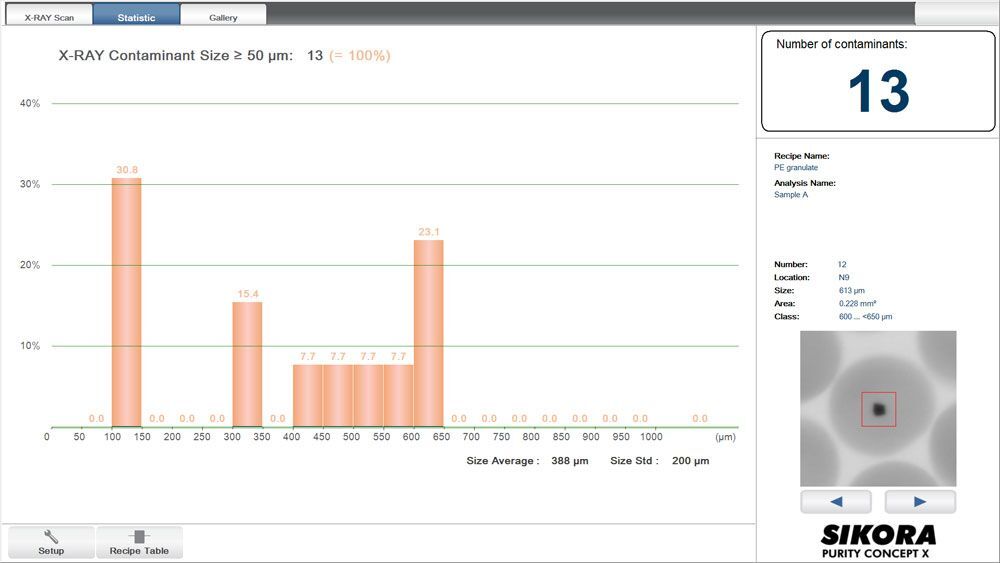 The inspection process is fully automatic and provides detailed visual results on a monitor within seconds, as well as color-coded markings directly on the sample. In addition, the CCA generates a comprehensive test certificate with information on the number, size, and color spectrum of detected contaminations, making it easier to assess material quality and approve it for production or delivery.