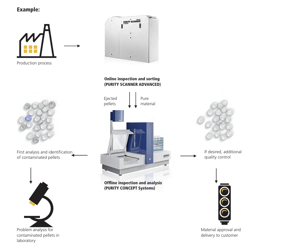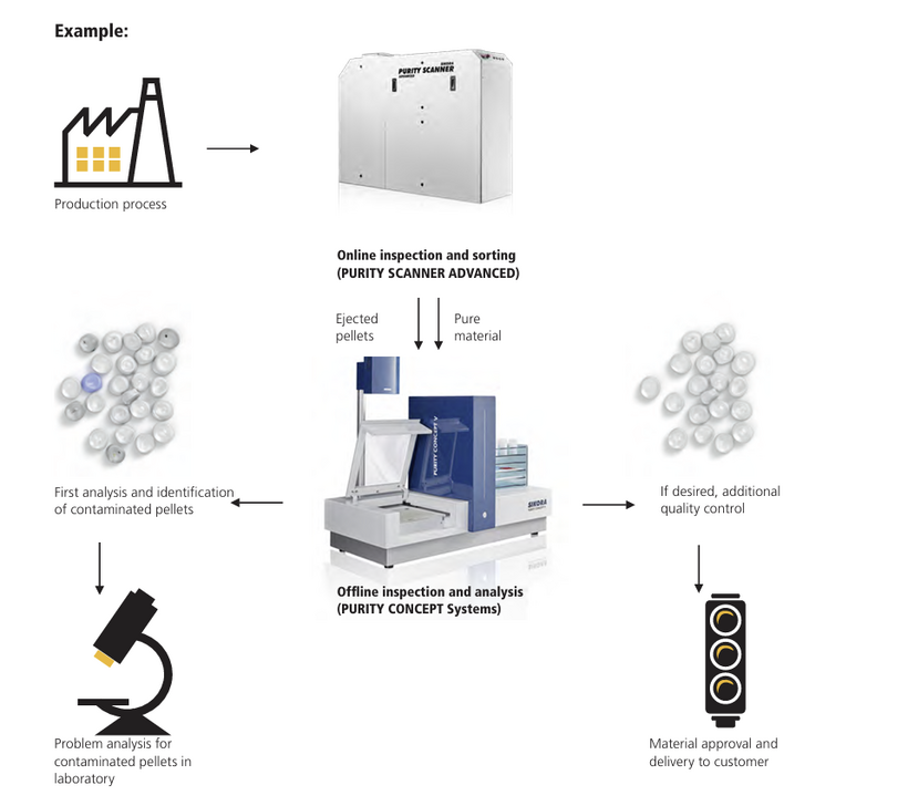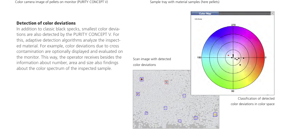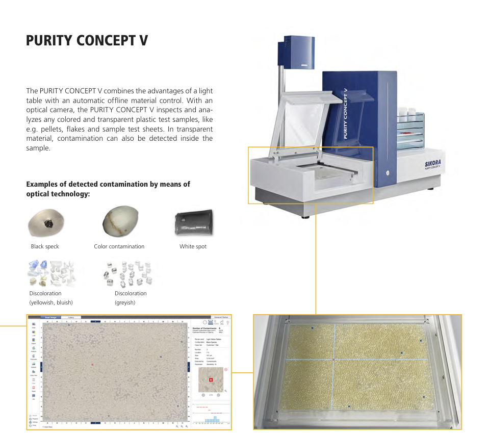 SIKORA PURITY CONCEPT V je inovativní, optický offline inspekční systém určený pro laboratorní kontrolu plastových materiálů. Zařízení využívá vysoce kvalitní optickou CMOS line scan barevnou kameru s rozlišením 50 µm pro detekci různých typů kontaminací – jako jsou „black specks“, barevné odchylky, bílé skvrny a jiné povrchové nečistoty – v průhledných i barevných plastových granulátech, flakes či testovacích deskách.