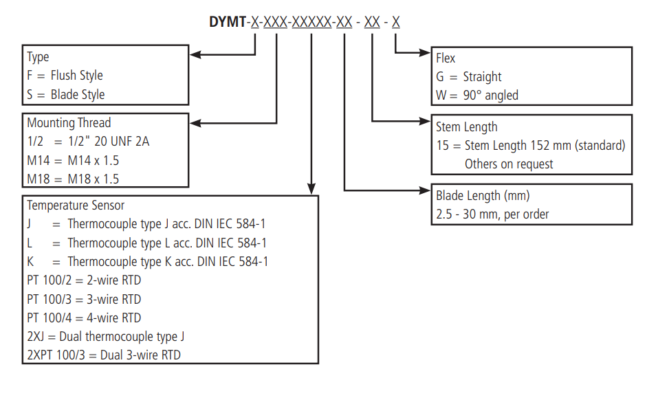 Termočlánky taveniny řady DYMT jsou speciálně navrženy tak, aby splňovaly požadavky polymerního průmyslu. Flexibilní konstrukce této řady umožňuje použití v procesu vytlačování a vstřikování. Montážní závit je kompatibilní se závity používanými pro měření tlaku taveniny. Proto je řada DYMT připravena k použití ve většině vytlačovacích systémů. Termočlánky ve stylu lopatek mají jedinečnou konstrukci lopatek, která snižuje tření v proudu taveniny, speciální rotační konstrukce lopatek umožňuje instalaci s nízkým třením. Tavné termočlánky řady DYMT jsou k dispozici také s dvojitým TC nebo RTD.