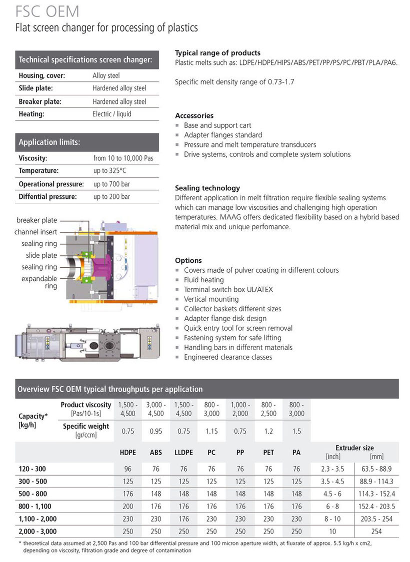 Nová verze hydraulických a ručních filtračních systémů od firmy MAAG.  FSC OEM je ultrakompaktní konstrukce nenáročná na údržbu a poskytuje přesný průtok i při vysokých tlacích. Ultra-krátké průtokové kanály snižují pokles tlaku, podporují rovnoměrnější teplotu produktu a umožňují této generaci filtrů pracovat tam, kde ostatní dosáhli svých limitů.
